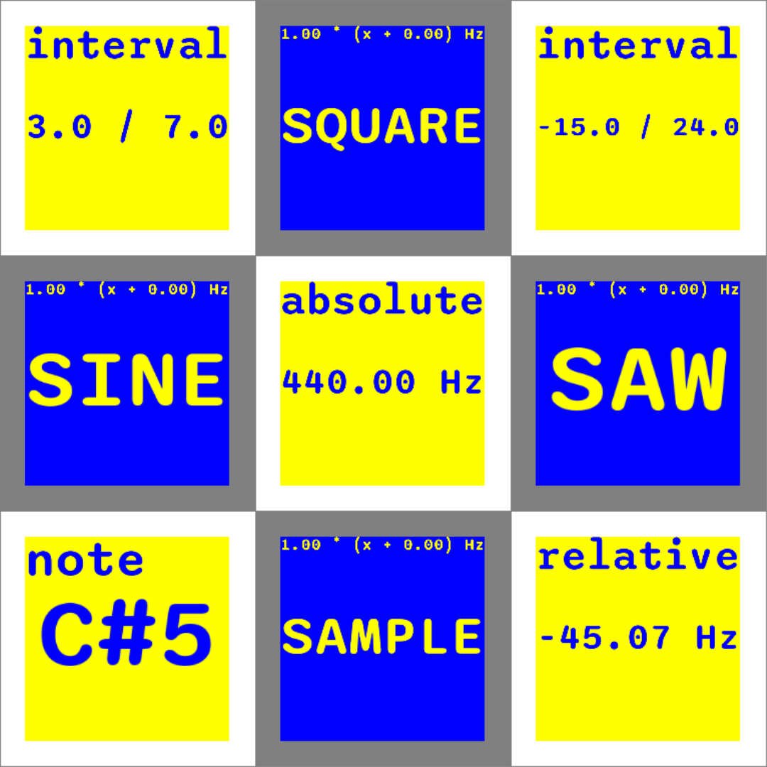 There are four types of sequencer blocks, designed to encourage microtonality. The 'absolute' type sets the current frequency to a set value. The 'relative' block adds or subtracts an offset from the previously set frequency. Sequencer blocks of type 'note' allow for selecting a note from the twelve-tone equal temperament system (mainly for accessibility). Lastly, 'interval' blocks transpose the last frequency by a number of steps in a configurable edo (equal division of the octave) scale.